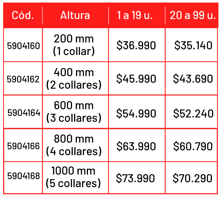 Dimensiones exteriores LxA: 600 x 600 mm / Alto variable según cantidad de collares, cada collar mide 200 mm de altura.